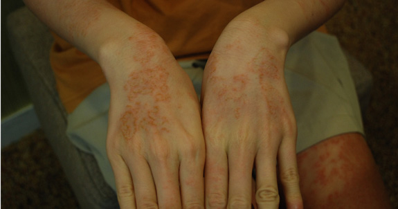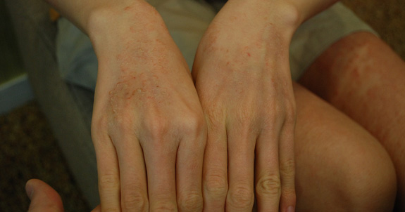 손에 비늘을 동반한 홍반 및 갈라짐, 물집, 진물이 생기고 심한 건조감과 및 손등까지 번질 수 있습니다.